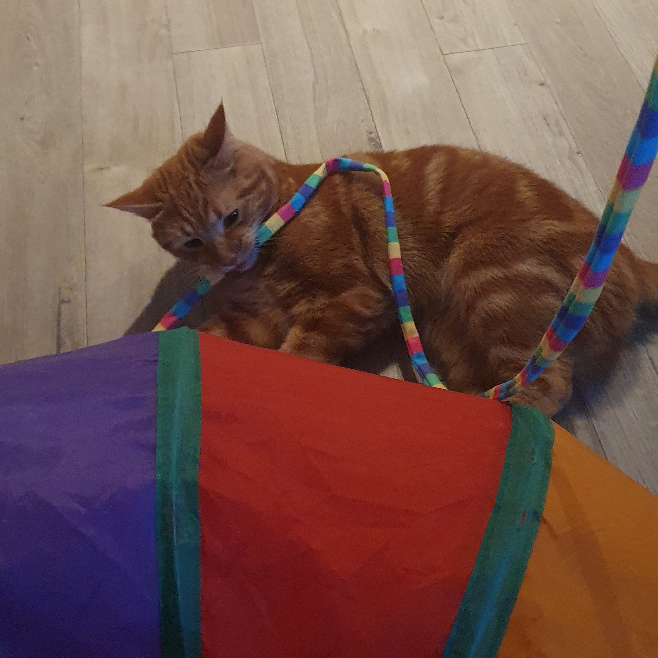 One of his favourite toys is the tunnel. He throws himself into it at speed and rolls around the room in it. He prefers to play with the tunnel and fishing rod style toys at the same time.