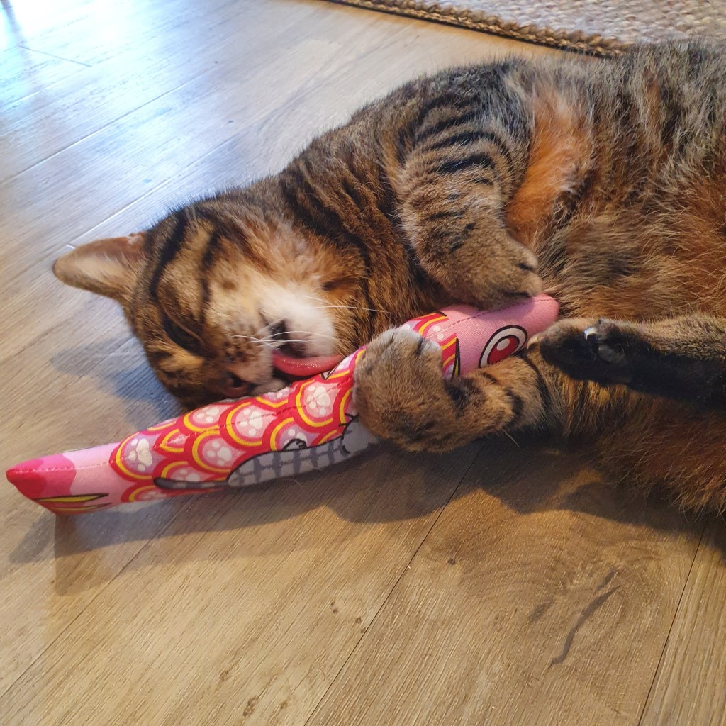 My favourite thing is to send it ‘flying’ through the house so Dirk can go and chase it. He doesn’t really let go of this toy very easily though. I guess he’s happy he’s our only cat because sharing toys would be a serious problem…