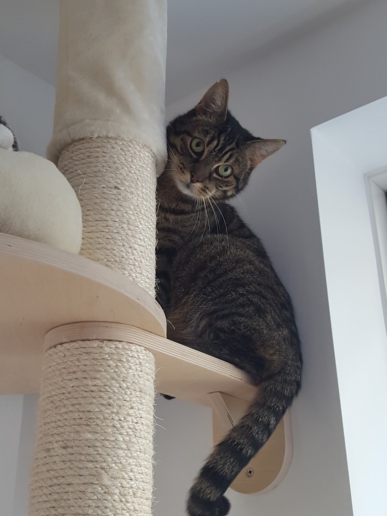 Dirk also loves the most recent addition, which is a floor to ceiling climbing tree. He actually uses it to scratch, climb and sleep and has left the sofa and chairs alone since the tree’s introduction (knock on wood).